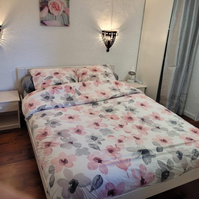Une chambre au calme avec un grand lit confortable, table de nuit avec lampe et prises électriques, 2 placards pour ranger vos affaires et une fenêtre laisse entrer la lumière naturelle.